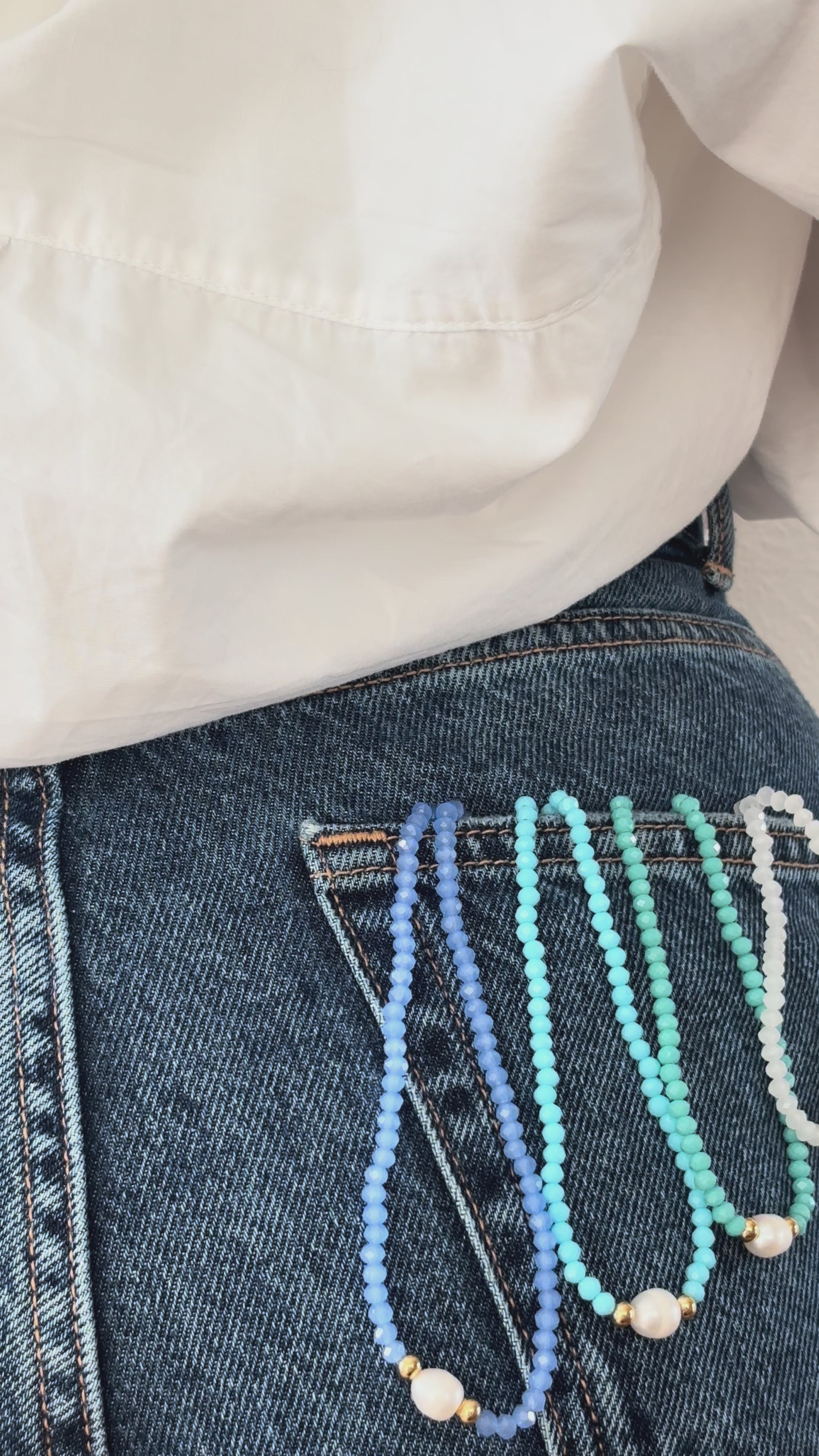 В центъра на колието, висококачествена имитация на перла осигурява елегантен фокусен акцент, ограден от две позлатени мъниста от неръждаема стомана – хармоничен контраст с цветната перлена огърлица в ярко синьо или наситено полунощно синьо.